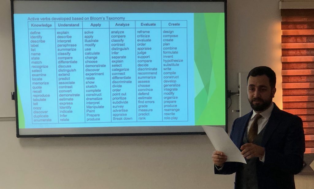 The workshop mainly aimed at defining learning outcomes, discussing assessment tools and conducting calculations based on ECTS scale.